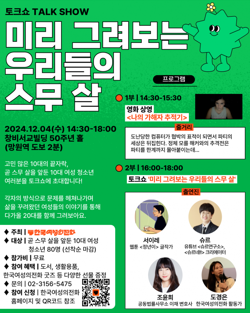 고민 많은 10대의 끝자락, 곧 스무 살을 앞둔 10대 여성 청소년 여러분을 한국여성의전화 토크쇼에 초대합니다!