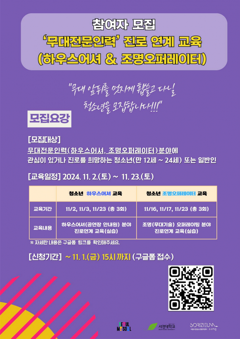사업내용: 청소년 대상 무대전문인력 진로 연계 프로그램 운영(2개 과정)