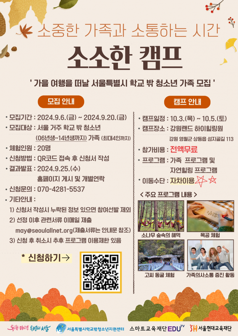 목록 [동작구] [학교밖청소년지원센터] 소중한 가족과 소통하는 시간 소소한 캠프 안내 페이지 정보 작성자 한창수 댓글 0건 조회 215회 작성일 2024-09-10 본문 . 이전글[서울특별시] 2024년 청소년 대상 마약류 예방교육극 뮤지컬 공연 안내 24.09.11 다음글[문래청소년센터] 2024년 청소년 프리마켓 '달촌 야시장의 가을(Autumn)' 청소년 셀러 모집 안내 24.09.10 댓글 0 댓글목록 등록된 댓글이 없습니다. 목록