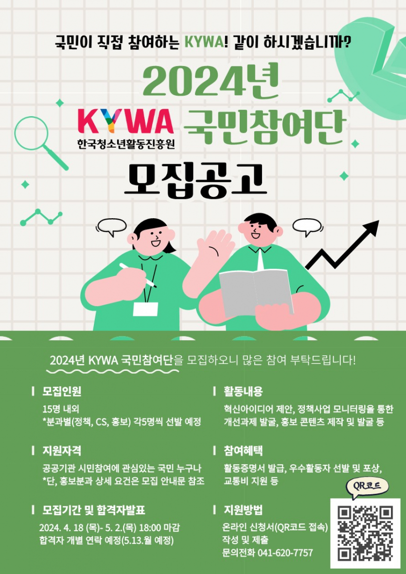 2. 한국청소년활동진흥원은 주요 정책 수립 및 혁신과제 발굴 등 사업 전반에 국민이 참여할 수 있는「2024년 KYWA 국민참여단」을 모집하오니 참신한 인력 구성이 될 수 있도록 많은 참여와 홍보 협조 부탁드립니다.