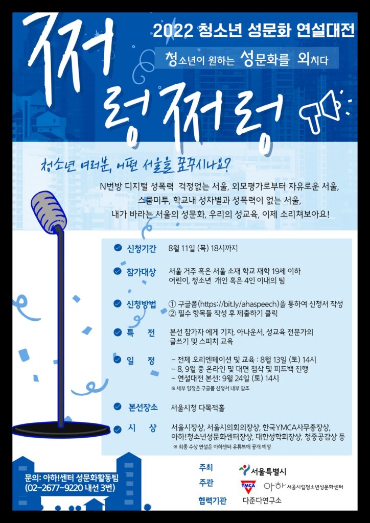 수정 삭제 목록 [청소년 성문화 연설대전 '쩌렁쩌렁'] 참여자 모집 페이지 정보 작성자 서울시립아하청소년성문화센터 댓글 0건 조회 1,582회 작성일 2022-08-05 본문 ○ 접수방법- 구글폼 ( https://bit.ly/ahaspeech )을 통한 신청 이전글[모집] 청소년 진로탐색 프로그램 '내일드림 #스타트업편' 8월 22.08.05 다음글[MnJ문화복지재단] 제5회 꿈사진 꿈영상 공모전 22.07.29 댓글 0 댓글목록 등록된 댓글이 없습니다. 수정 삭제 목록
