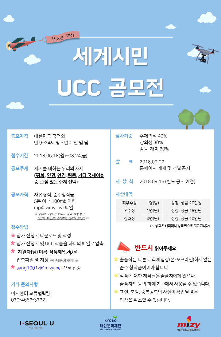 수정 삭제 목록 [공모전] 2018 세계시민 UCC 공모전 페이지 정보 작성자 서울시립청소년문화교류센터 댓글 0건 조회 2,604회 작성일 2018-06-18 본문 공모전 참가 지원서는 하단의 링크에서 첨부파일에서 다운받으실 수 있습니다. 링크: http://mizy.net/program.html?html=program/program2_view.html&uid=509 이전글2018 하계 캄보디아 국제봉사캠프(해외봉사단) 5기 모집 18.06.23 다음글여성가족부 주최 2018년 인터넷, 스마트폰 쉼표캠프 참가자 모집 18.06.15 댓글 0 댓글목록 등록된 댓글이 없습니다. 수정 삭제 목록