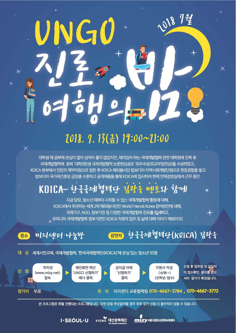 수정 삭제 목록 [모집] UNGO 진로 여행의 밤 - 한국국제협력단(KOICA) 멘토 강연 페이지 정보 작성자 서울시립청소년문화교류센터 댓글 0건 조회 2,610회 작성일 2018-07-03 본문 [참가신청] 이전글<2018 꿈다락 토요문화학교> 웹툰, 문학을 담다 18.07.06 다음글청소년을 위한 EASY토론 프로그램 18.06.28 댓글 0 댓글목록 등록된 댓글이 없습니다. 수정 삭제 목록