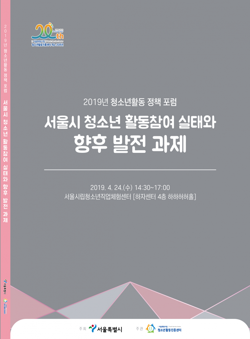 「2018청소년활동 참여 실태 및 요구조사」 결과를 토대로 향후 청소년활동의 지향점과 정책 방향을 모색하기 위하여 마련된 2019년 청소년활동 청책포럼 자료집