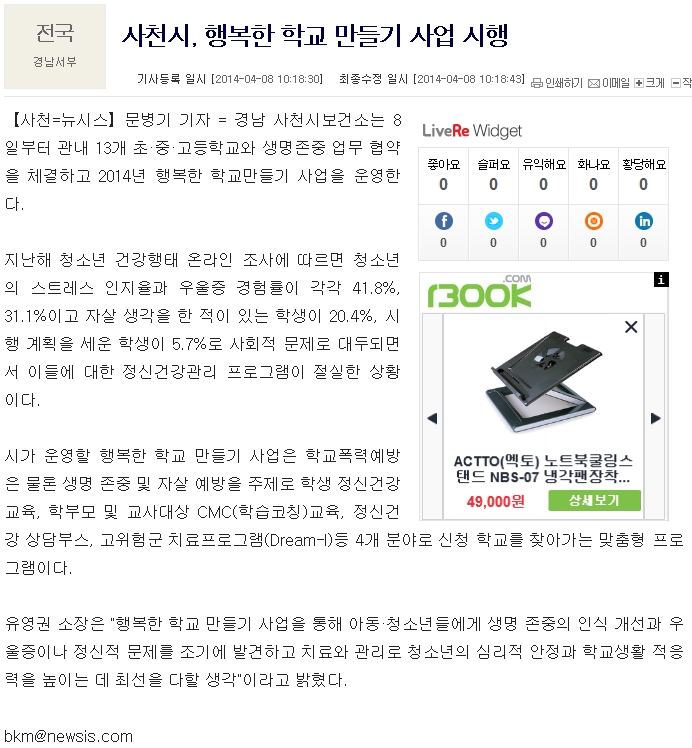 유영권 소장은 "행복한 학교 만들기 사업을 통해 아동·청소년들에게 생명 존중의 인식 개선과 우울증이나 정신적 문제를 조기에 발견하고 치료와 관리로 청소년의 심리적 안정과 학교생활 적응력을 높이는 데 최선을 다할 생각"이라고 밝혔다.