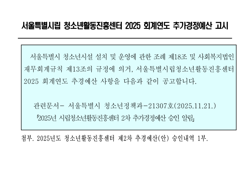 [공지] 2025년 2차 시립청소년활동진흥센터 추경예산 승인 공고