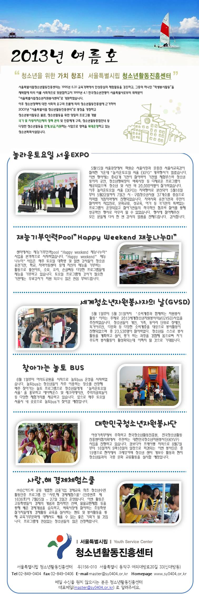 수정 삭제 목록 서울청소년활동진흥센터 뉴스레터 - 여름호 페이지 정보 작성자 댓글 0건 조회 2,491회 작성일 2013-07-10 본문 추천0 이전글청소년멘토링활동 대학생 멘토 모집 13.07.24 다음글2013 청소년 문화존 모니터요원 모집 13.07.09 댓글 0 댓글목록 등록된 댓글이 없습니다. 수정 삭제 목록