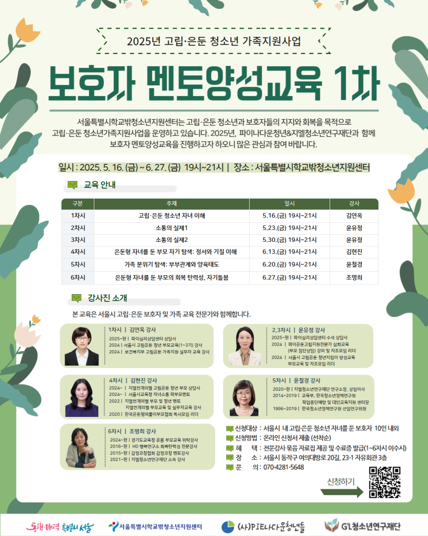 목록 [동작구] [학교밖청소년지원센터] 2025년 고립 은둔 청소년 가족지원사업 보호자 멘토양성교육 1차 모집 안내 페이지 정보 작성자 한창수 댓글 0건 조회 315회 작성일 2025-05-13 본문 . 이전글[보라매청소년센터 2025년 서울국제정원박람회와 함께하는 보라매 플리마켓 참여 안내 25.05.13 다음글[노원청소년미래진로센터] 몽골 ICT봉사단 참가자 모집 안내 25.05.12 댓글 0 댓글목록 등록된 댓글이 없습니다. 목록