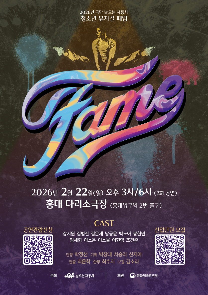 목록 [성북구] [날으는자동차] 2026년 극단 날으는 자동차 청소년 뮤지컬 페임 안내 페이지 정보 작성자 관리자 댓글 0건 조회 8회 작성일 2026-01-27 본문 . 다음글[라이나전성기재단] <바랑재 드림 키친> 참여자 모집 26.01.27 댓글 0 댓글목록 등록된 댓글이 없습니다. 목록