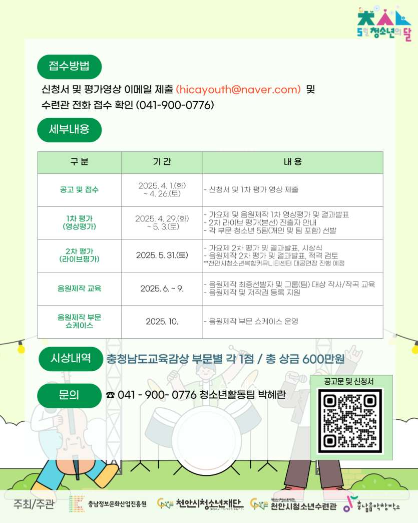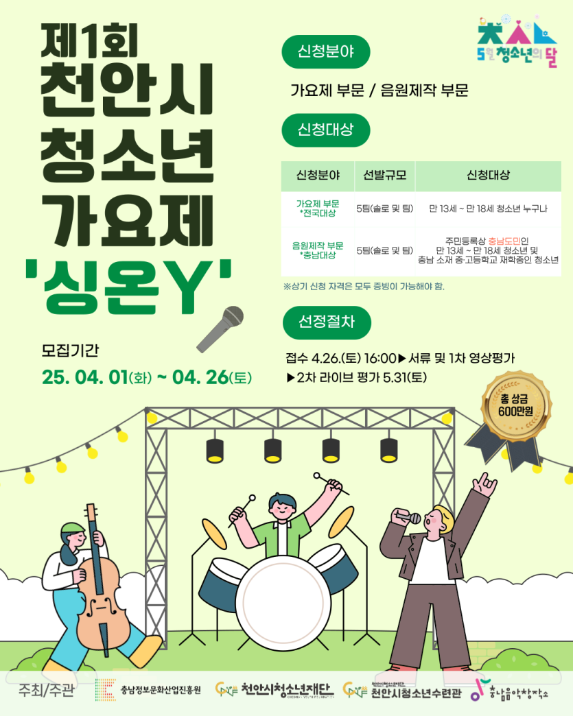 목록 [서울 외] [천안시청소년재단천안시청소년수련관] 제1회 천안시청소년가요제 싱온Y 모집안내 페이지 정보 작성자 한창수 댓글 0건 조회 352회 작성일 2025-04-11 본문 . 이전글[청소년음악센터] 2025년 청소년맞춤형 음악사업 안내 25.04.14 다음글[청소년문화교류센터] 미지동아리지원사업 세계시민동아리 모집 안내 25.04.11 댓글 0 댓글목록 등록된 댓글이 없습니다. 목록