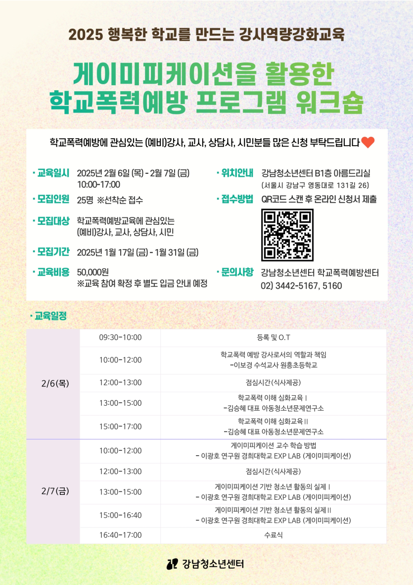 목록 [강남구] [강남청소년센터] 게이미피이션을 활용한 학교폭력예방교육 페이지 정보 작성자 한창수 댓글 0건 조회 444회 작성일 2025-01-20 본문 . 이전글[아이들과 미래재단] 아이들과미래재단 '아모레퍼시픽×무신사 MEET YOUR DREAM 캠페인' 참여 청소년 모집 25.01.24 다음글[노원미래진로센터] 스탬프 에듀투어 참가자 모집 25.01.16 댓글 0 댓글목록 등록된 댓글이 없습니다. 목록