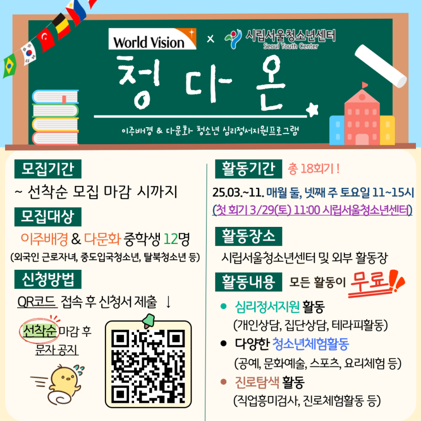 목록 [중구] [서울청소년센터] 이주배경 및 다문화 청소년 프로그램 '청다온' 안내 페이지 정보 작성자 한창수 댓글 0건 조회 412회 작성일 2025-02-10 본문 이전글[청소년음악센터] 2025년 서울 청소년 오케스트라 페스티벌 참가자 모집 안내 25.02.17 다음글[한국문회예술위원회] 아르코미술관 전시 연계 교육프로그램 안내 25.02.07 댓글 0 댓글목록 등록된 댓글이 없습니다. 목록