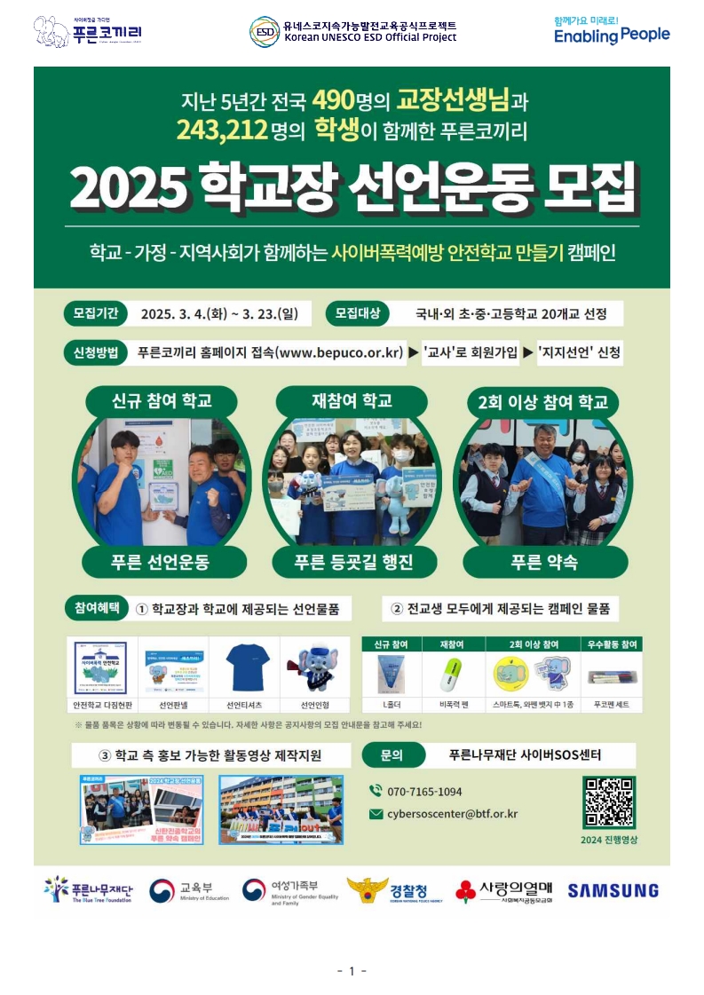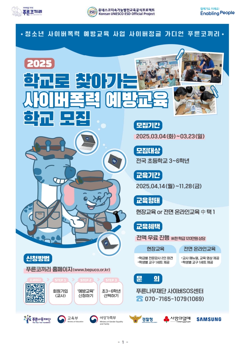 목록 [용산구] [청소년미디어센터] 2025푸른코끼리 사이버 폭력 예방교육 및 캠페인 참여학교 모집 페이지 정보 작성자 한창수 댓글 0건 조회 470회 작성일 2025-02-24 본문 . 이전글2025년 서울시민상(어린이 및 청소년상) 수상후보자 추천 안내 25.02.28 다음글[MnJ문화복지재단] FOR YOUTH, FIVE SPACES 전시회_2025년 청년예술가 개인전 지원사업 25.02.20 댓글 0 댓글목록 등록된 댓글이 없습니다. 목록