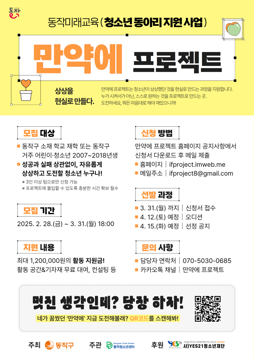 목록 [동작구] 2025. 동작미래교육 만약에 프로젝트 안내 페이지 정보 작성자 한창수 댓글 0건 조회 499회 작성일 2025-02-28 본문 . 이전글[청소년음악센터] <소리지음 뮤지컬 극단> 정기공연 안내 25.03.04 다음글[MnJ문화복지재단] 2026년 청년 예술가 개인전 지원사업 공모 For Youth, Five Spaces 25.02.28 댓글 0 댓글목록 등록된 댓글이 없습니다. 목록