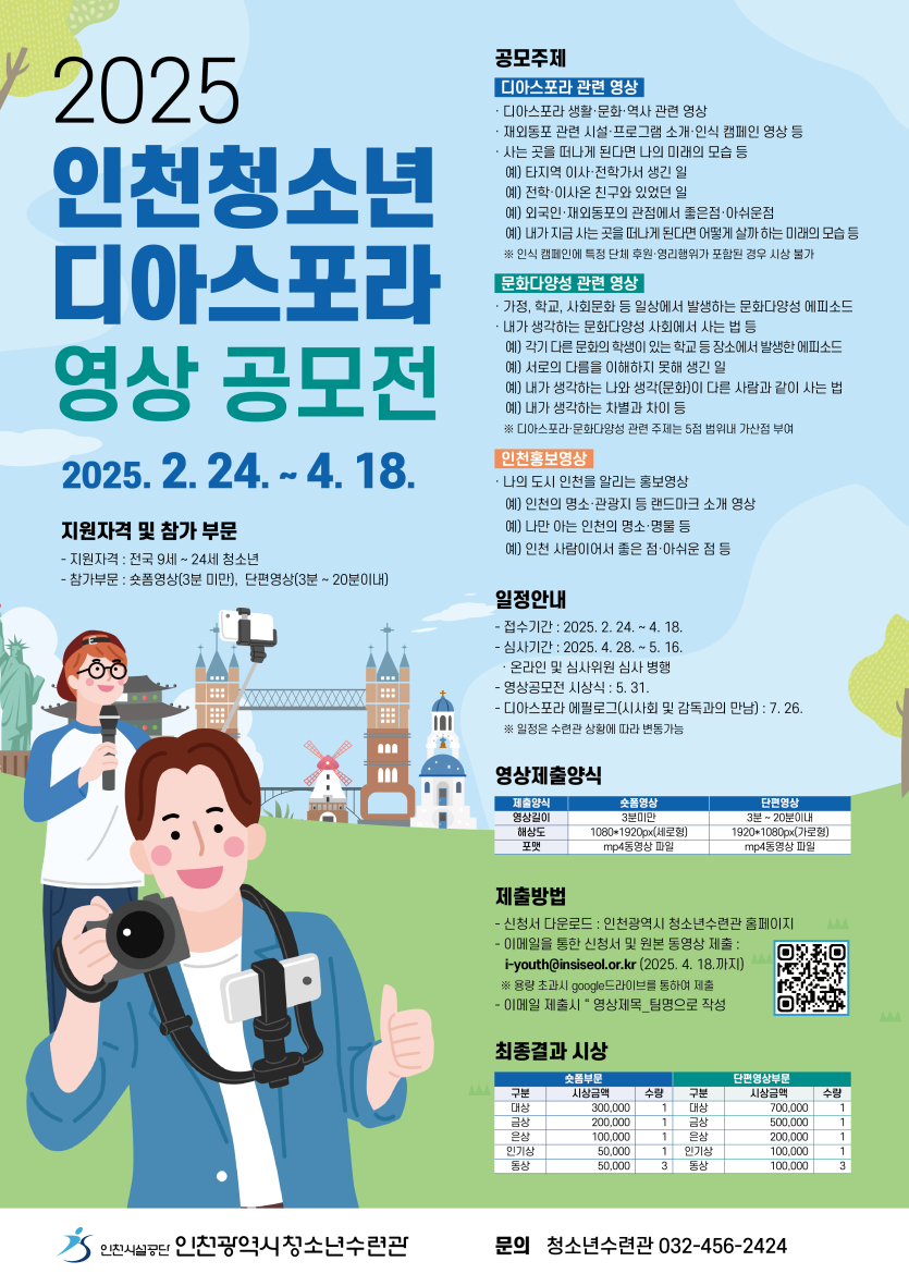 목록 [서울 외] 2025년 인천 청소년 디아스포라 영상공모전 안내 페이지 정보 작성자 한창수 댓글 0건 조회 400회 작성일 2025-03-06 본문 . 이전글[아하!청소년성문화센터] 성상담 전문가 양성 워크숍 안내 25.03.07 다음글[청소년음악센터] <소리지음 뮤지컬 극단> 정기공연 안내 25.03.04 댓글 0 댓글목록 등록된 댓글이 없습니다. 목록