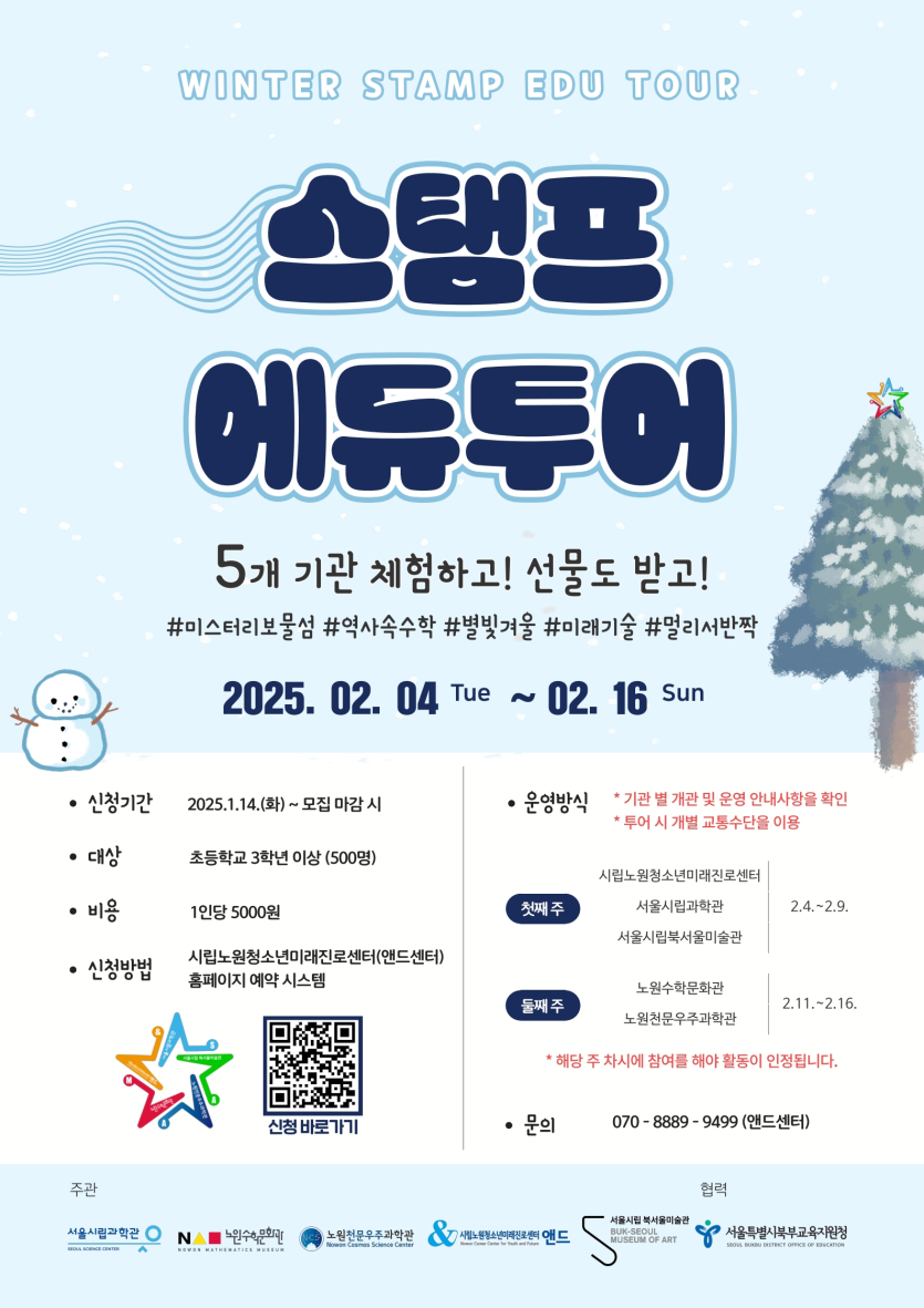 목록 [노원구] [노원미래진로센터] 스탬프 에듀투어 참가자 모집 페이지 정보 작성자 한창수 댓글 0건 조회 433회 작성일 2025-01-16 본문 . 이전글[강남청소년센터] 게이미피이션을 활용한 학교폭력예방교육 25.01.20 다음글[한국자원봉사문화] CJ그룹 임직원과 함께하는 청소년 온라인 진로멘토링 모집 25.01.13 댓글 0 댓글목록 등록된 댓글이 없습니다. 목록