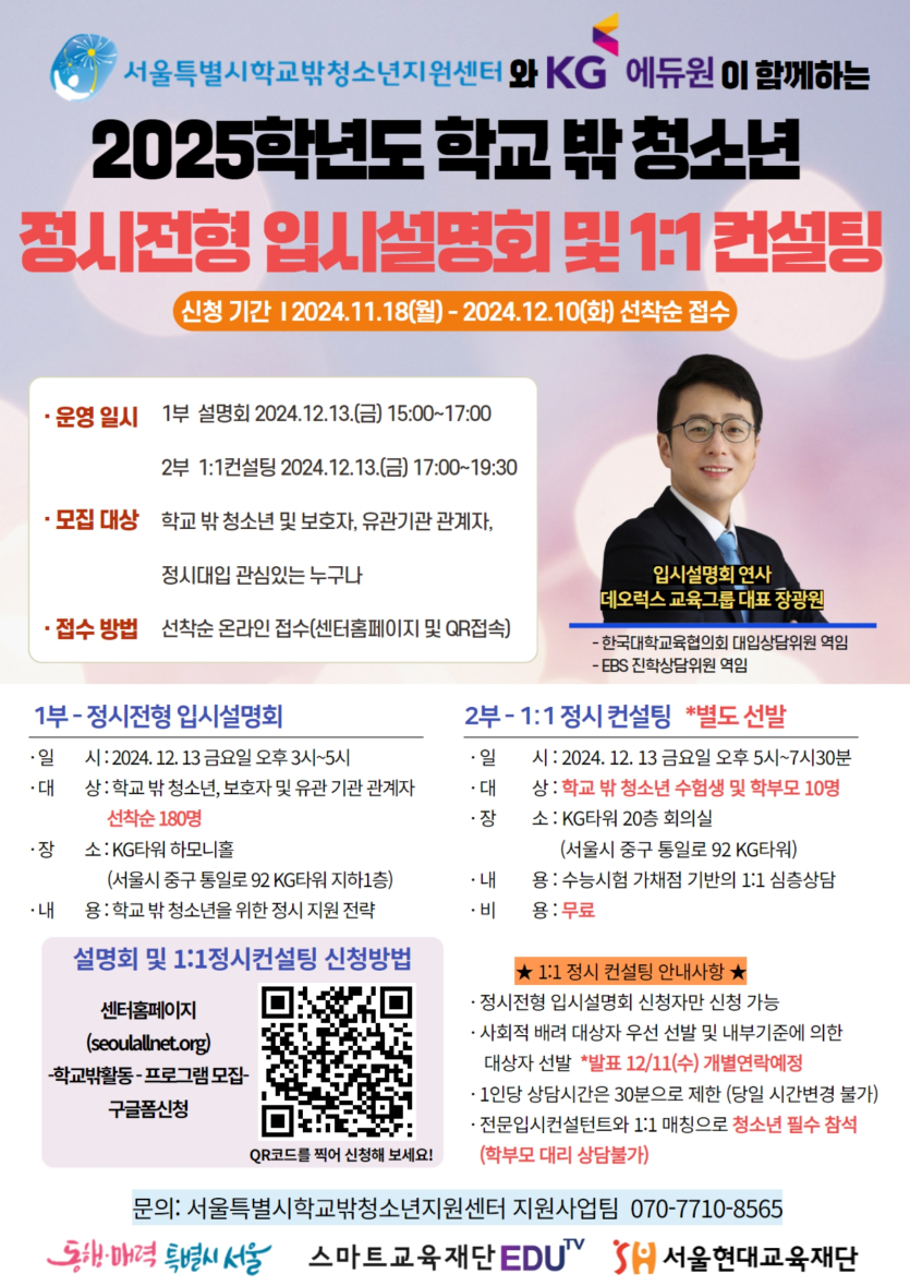 2024.12.13.(금) 17:00~19:30 | - 1:1 정시 컨설팅 | 10명 | KG타워 20층 회의실 (서울 중구소재) | 신청자 중 대상자 선발 예정 |