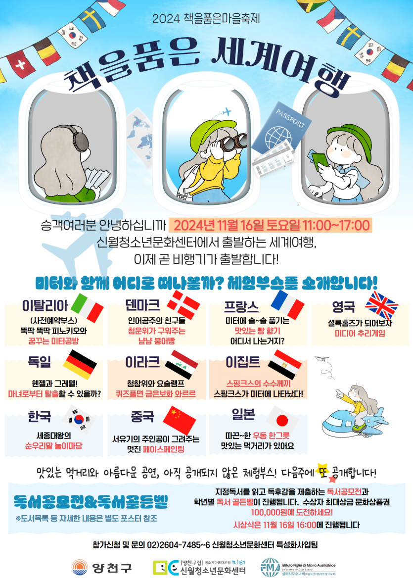목록 [양천구] [양천구립신월청소년문화센터] 책을 품은 축제 홍보 안내 페이지 정보 작성자 한창수 댓글 0건 조회 493회 작성일 2024-11-01 본문 . 이전글[한국청소년재단] 제9회 대한민국 청소년 희망대상 안내 24.11.01 다음글[과학의전당] 제2회 미래청소년과학오디션 안내 24.10.31 댓글 0 댓글목록 등록된 댓글이 없습니다. 목록