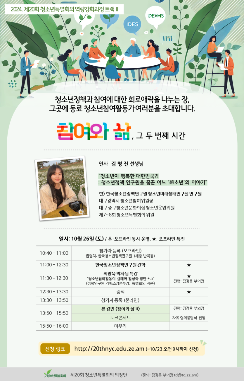 목록 [서대문구] [청소년특별회의] 참여와 삶, 그 두 번째 시간 안내 페이지 정보 작성자 한창수 댓글 0건 조회 475회 작성일 2024-10-22 본문 . 이전글[서울특별시] 2024년 청소년 참여활동 수기 공모전 "청소년 참여활동을 통한 변화와 성장" 안내 24.10.23 다음글[학교밖청소년지원센터] 2024년 찾아가는 상담 및 심리검사 참여자 모집 안내 24.10.18 댓글 0 댓글목록 등록된 댓글이 없습니다. 목록
