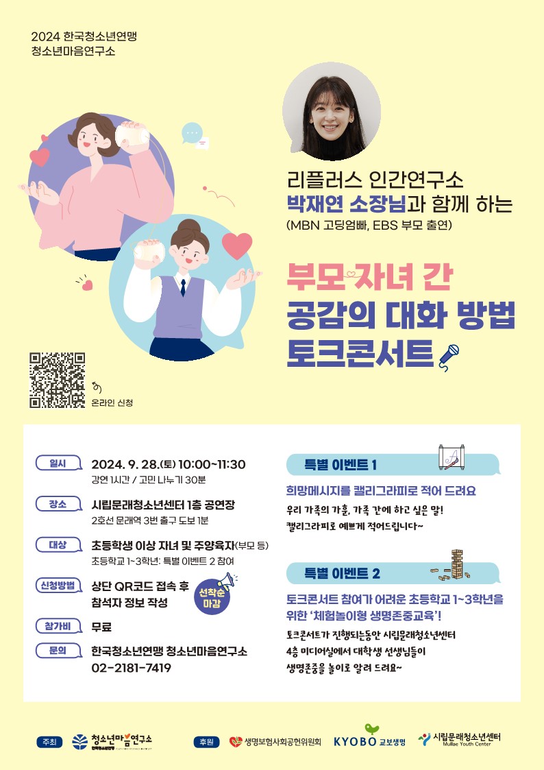 목록 [동작구] [한국청소년연맹] 2024년 청소년 생명존중 토크콘서트 안내 페이지 정보 작성자 관리자 댓글 0건 조회 478회 작성일 2024-08-19 본문 . 이전글[강서청소년회관] 2024 강서구 청소년어울림마당「에.(愛)이.(렇게)스.(스로)」 8월‘화is ___.’「청소년 화(火):잇팅(eating)!」 24.08.20 다음글[시립마포청소년센터] 2024년 디지털 도구 활용 유해환경 인식 개선 프로그램 '헷툰' 전시 안내 24.08.19 댓글 0 댓글목록 등록된 댓글이 없습니다. 목록