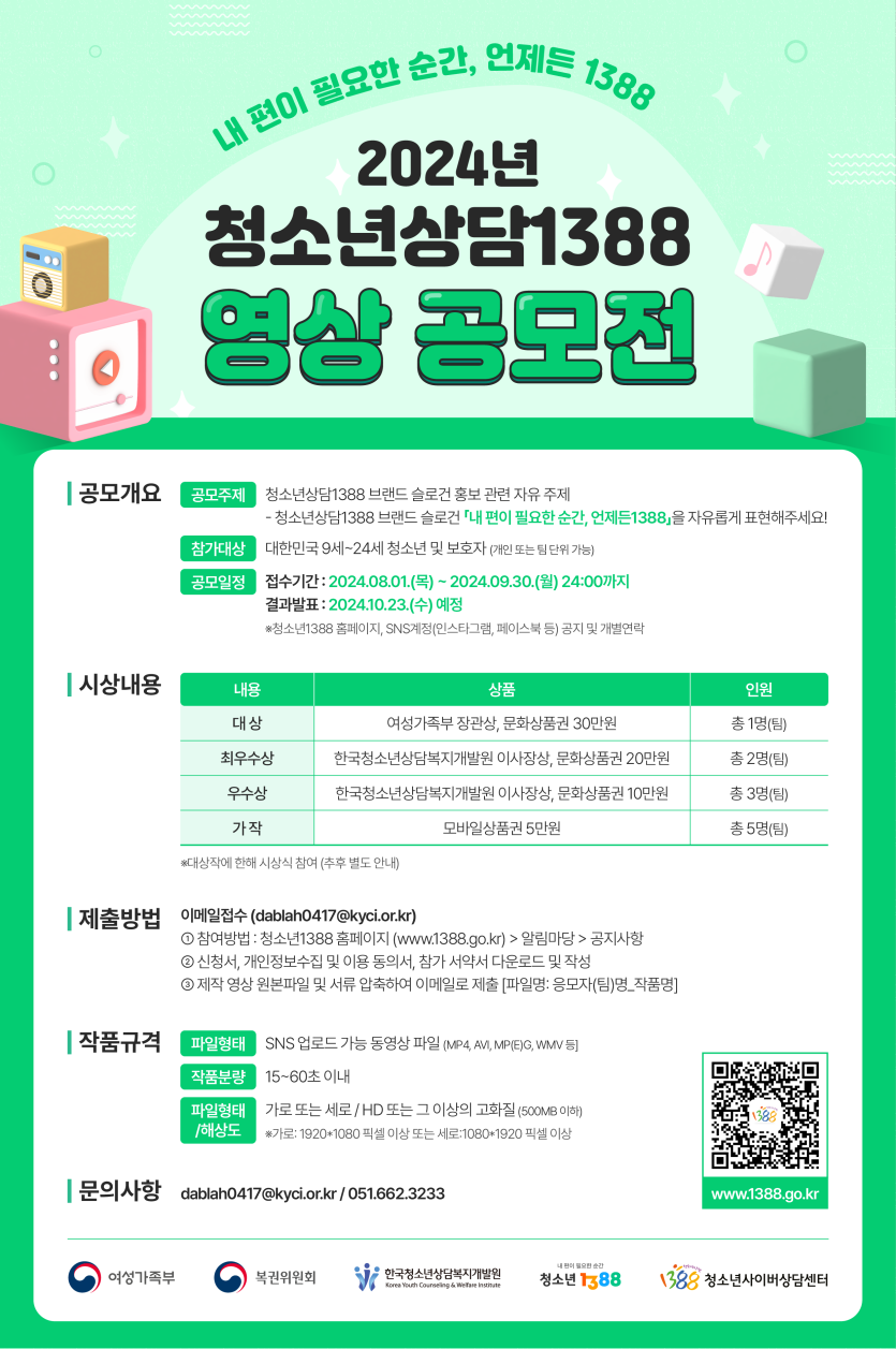 - 공모명: 2024년 청소년상담1388 영상 공모전