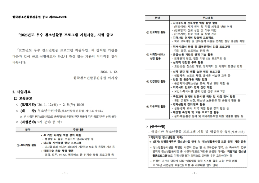 [서대문구] [ 한국청소년활동진흥원] 2026년도 우수 청소년활동 프로그램 지원사업 시행 공고