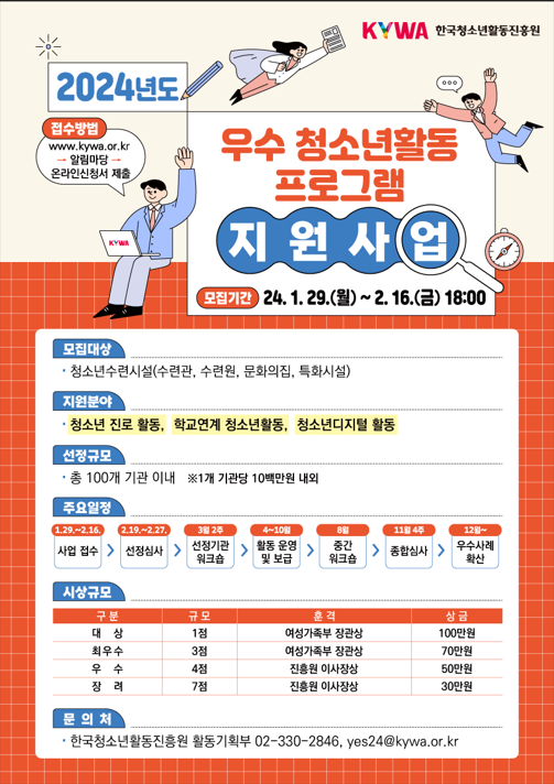 - 다음글[홍보] 2024년 취약지역 청소년수련시설-학교 네트워킹 지원사업 참여기관 모집 24.01.29