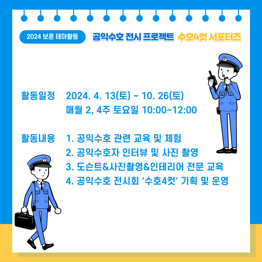 - 활동일정: 2024. 4. 12(토) ~ 10. 26(토) 매월 2, 4주 토요일 10:00~12:00