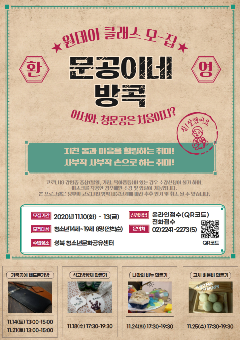 [청소년문화공유센터]11월 원데이클래스[문공이네 방콕] 참여자를 모집합니다(~11.13까지)