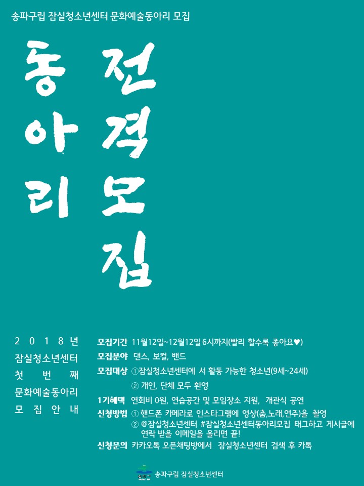 #문의: 카카오톡 오픈채팅방에서 잠실청소년센터 검색 후 카톡하기