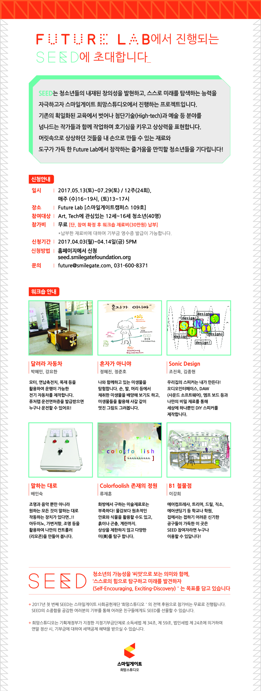스마일게이트 사회공헌재단 희망스튜디오에서 청소년들을 위한 ‘SEED’프로젝트를 진행합니다. 아동, 청소년들이 내재된 창의성을 발현하고 스스로 미래를 탐색하는 능력을 자극하고자 시작되는 SEED에 많은 관심과 참여 바랍니다.