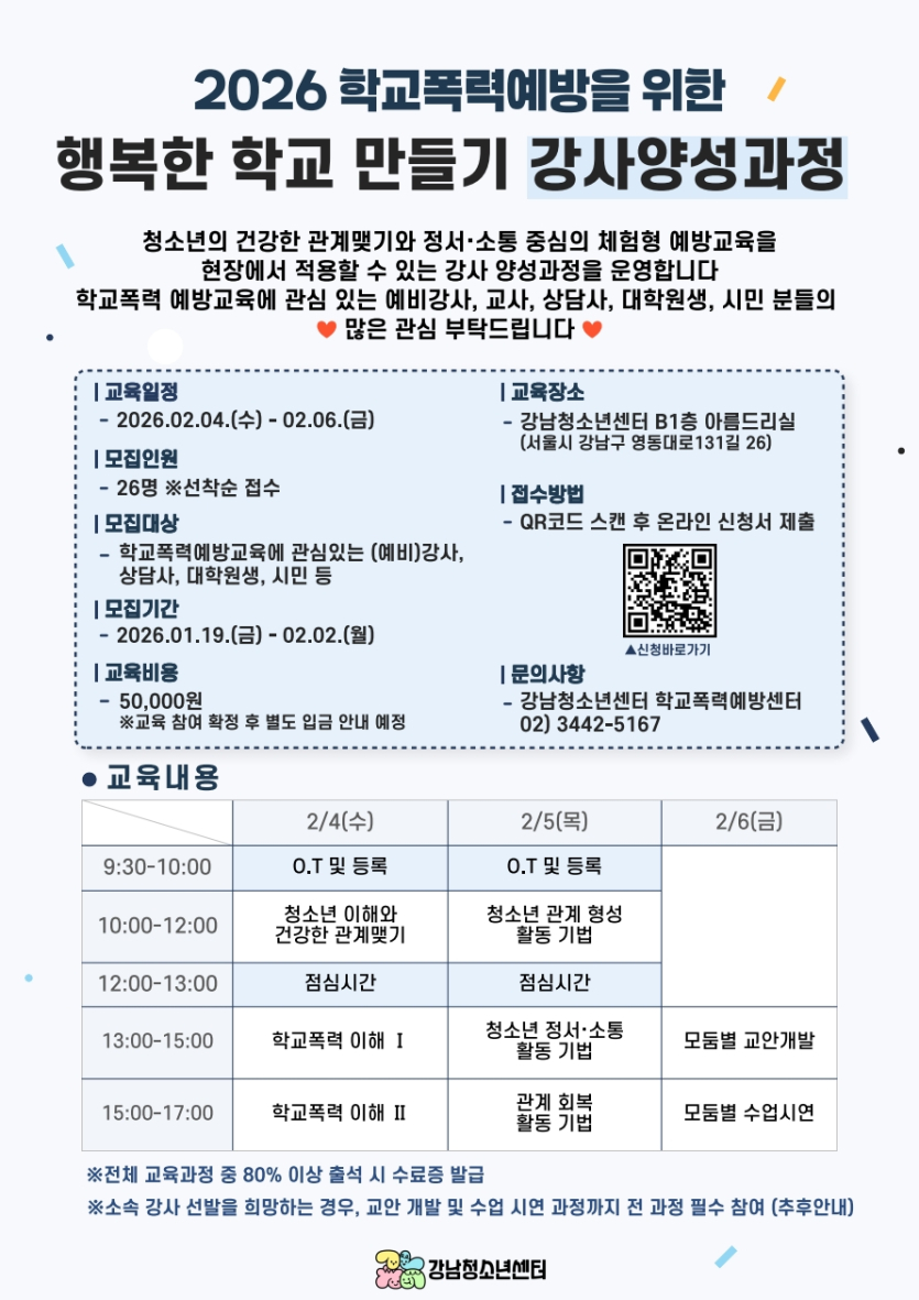 [강남구] [강남청소년센터] 2026 행복한 학교 만들기 강사양성과정 안내
