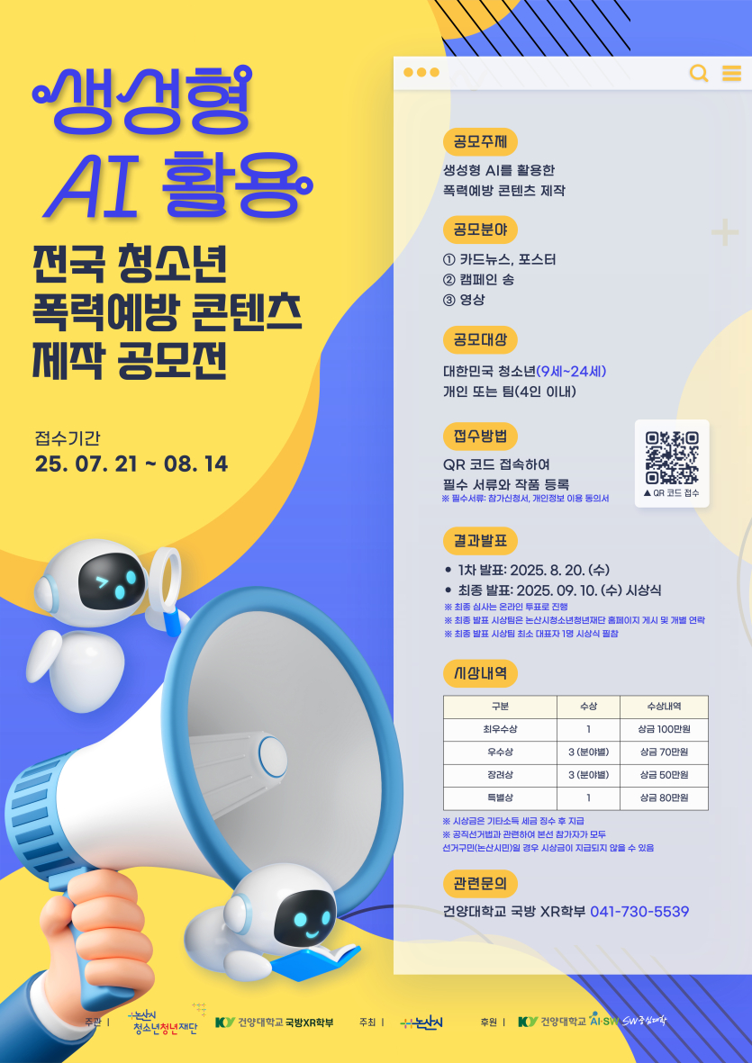 [서울 외] [논산시청소년재단]2025년 인구감소지역 청소년 성장지원 사업 "생성형AI를 활용한 전국 청소년 폭력 예방 콘텐츠 제작" 공모전