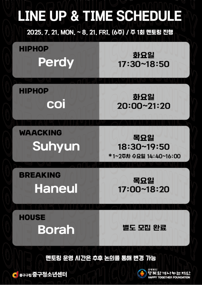 일정 | 2025. 7.21(월)~8.29(금) 중 주 1회/6주 ※장르별 세부 일정표(포스터) 참고 | 2025.8.30.(토) 14:00~16:00 |