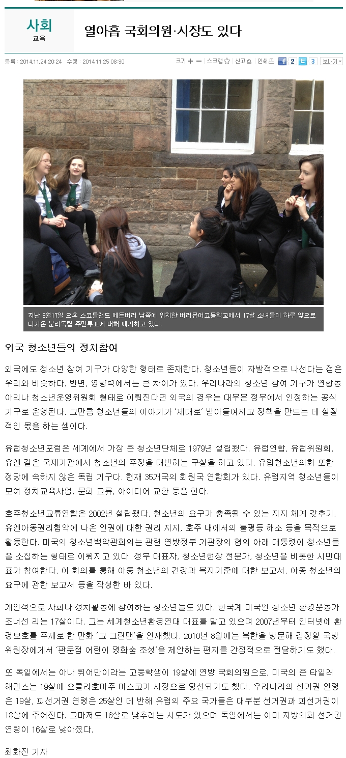 외국에도 청소년 참여 기구가 다양한 형태로 존재한다. 청소년들이 자발적으로 나선다는 점은 우리와 비슷하다. 반면, 영향력에서는 큰 차이가 있다. 우리나라의 청소년 참여 기구가 연합동아리나 청소년운영위원회 형태로 이뤄진다면 외국의 경우는 대부분 정부에서 인정하는 공식기구로 운영된다. 그만큼 청소년들의 이야기가 ‘제대로’ 받아들여지고 정책을 만드는 데 실질적인 몫을 하는 셈이다. 유럽청소년포럼은 세계에서 가장 큰 청소년단체로 1979년 설립됐다. 유럽연합, 유럽위원회, 유엔 같은 국제기관에서 청소년의 주장을 대변하는 구실을 하고 있다. 유럽청소년의회 또한 정당에 속하지 않은 독립 기구다. 현재 35개국의 회원국 연합회가 있다. 유럽지역 청소년들이 모여 정치교육사업, 문화 교류, 아이디어 교환 등을 한다. 호주청소년교류연합은 2002년 설립됐다. 청소년의 요구가 충족될 수 있는 지지 체계 갖추기, 유엔아동권리협약에 나온 인권에 대한 권리 지지, 호주 내에서의 불평등 해소 등을 목적으로 활동한다. 미국의 청소년백악관회의는 관련 연방정부 기관장의 협의 아래 대통령이 청소년들을 소집하는 형태로 이뤄지고 있다. 정부 대표자, 청소년현장 전문가, 청소년을 비롯한 시민대표가 참여한다. 이 회의를 통해 아동 청소년의 건강과 복지기준에 대한 보고서, 아동 청소년의 요구에 관한 보고서 등을 작성한 바 있다. 개인적으로 사회나 정치활동에 참여하는 청소년들도 있다. 한국계 미국인 청소년 환경운동가 조너선 리는 17살이다. 그는 세계청소년환경연대 대표를 맡고 있으며 2007년부터 인터넷에 환경보호를 주제로 한 만화 ‘고 그린맨’을 연재했다. 2010년 8월에는 북한을 방문해 김정일 국방위원장에게서 ‘판문점 어린이 평화숲 조성’을 제안하는 편지를 간접적으로 전달하기도 했다. 또 독일에서는 아나 뤼어만이라는 고등학생이 19살에 연방 국회의원으로, 미국의 존 타일러 해먼스는 19살에 오클라호마주 머스코기 시장으로 당선되기도 했다. 우리나라의 선거권 연령은 19살, 피선거권 연령은 25살인 데 반해 유럽의 주요 국가들은 대부분 선거권과 피선거권이 18살에 주어진다. 그마저도 16살로 낮추려는 시도가 있으며 독일에서는 이미 지방의회 선거권 연령이 16살로 낮아졌다.한겨례뉴스 / 2014.11.24 / 최화진 기자