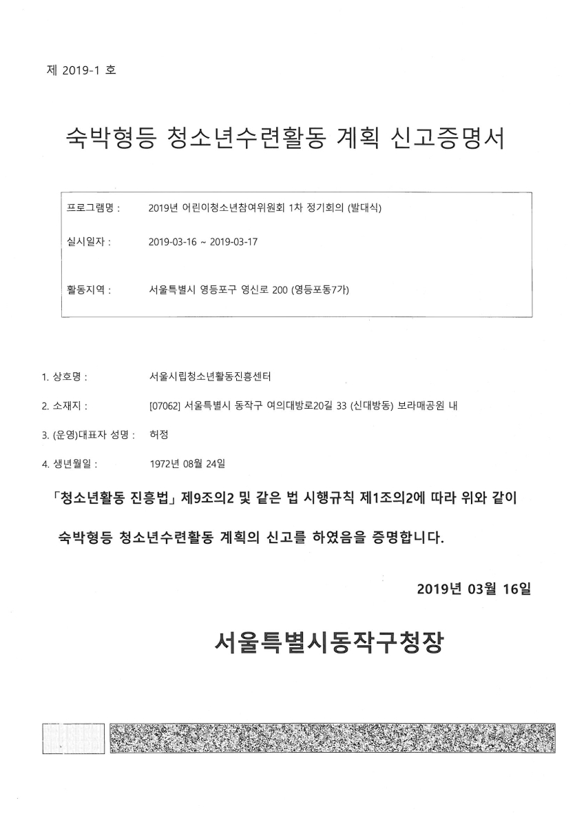목록 [2019년도 어린이청소년참여위원회 발대식] 청소년수련활동 신고수리 증명 페이지 정보 작성자 관리자 댓글 0건 조회 2,306회 작성일 2019-03-16 본문 추천0 이전글2019년 청소년정책포럼 청소년 토론자 선발 공고 19.03.18 다음글2019년 청소년참여 활동 조력자(퍼실리테이터) 모집 안내 19.03.13 댓글 0 댓글목록 등록된 댓글이 없습니다. 목록