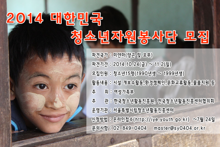 여성가족부와 서울특별시립청소년활동진흥센터에서는 청소년의 해외봉사활동, 문화체험 및 외국 청소년과의 교류활동을 통해 사회참여 현장을 해외로 확대하고, 세계시민의식 함양을 위해 2014년 대한민국청소년자원봉사단(Korea Youth Volunteer Programme) 참가자를 아래와 같이 추가 모집하오니 관심 있는 청소년 여러분의 적극적인 참여 바랍니다.