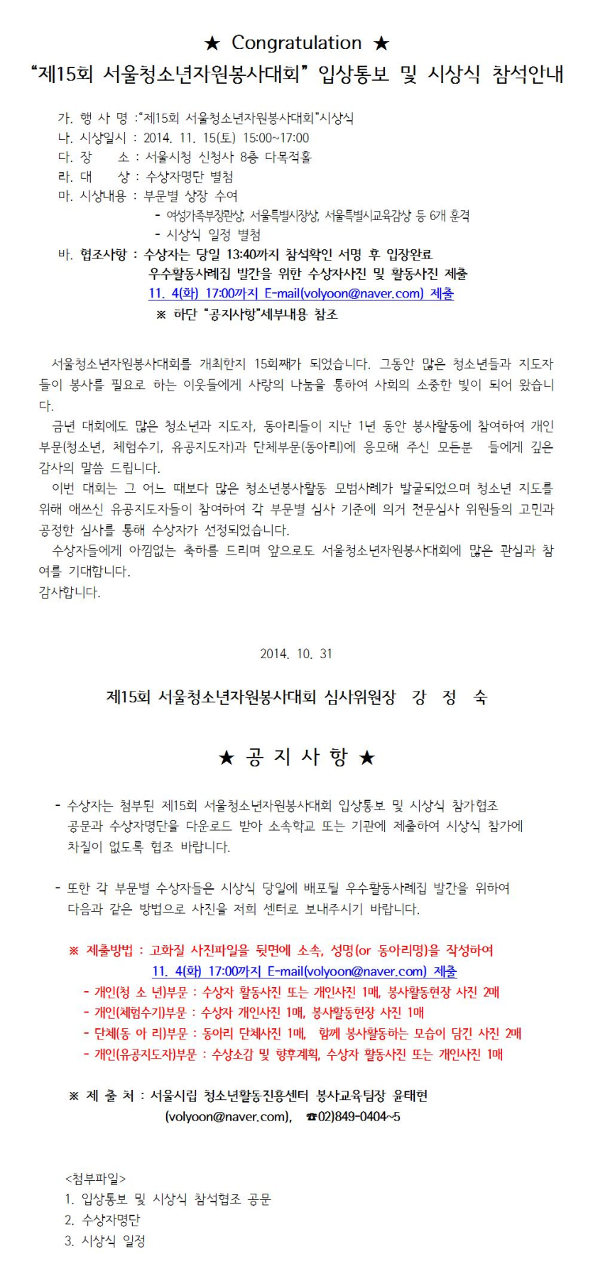 제15회 서울청소년자원봉사대회 입상통보 및 시상식 참석안내