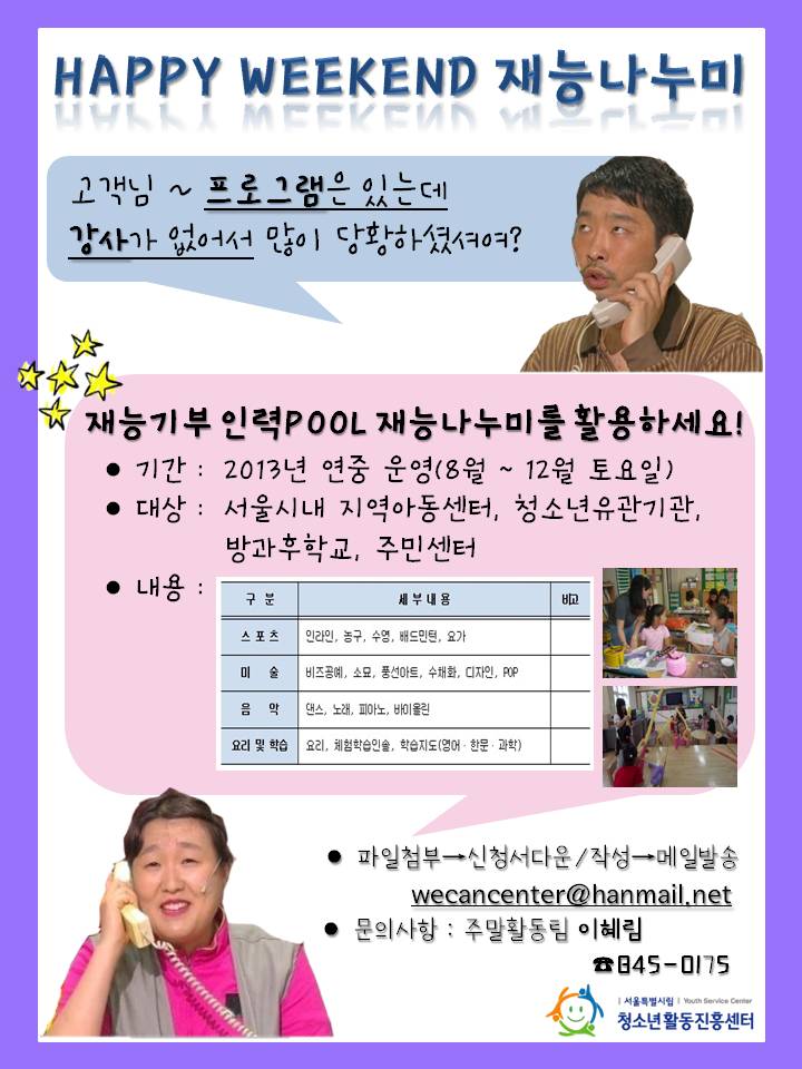 센터에서는 주말프로그램의 활성화를 위해 재능기부 인력 POOL을 무료로! 지원해드리는