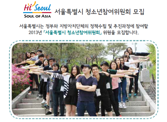 서울특별시는 청소년들이 정부와 지방자치단체의 청소년 정책 및 사업과정에 주도적으로 참여토록 하여 청소년 시책의 실효성을 제고하고 청소년 권익증진을 도모하고자 아래와 같이 <2013년 서울특별시 청소년참여위원회> 위원을 선발하오니, 역량 있는 청소년들의 많은 참여 바랍니다.