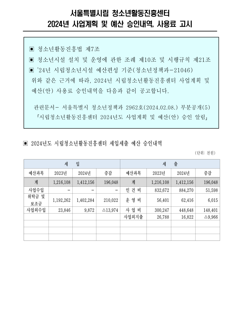 목록 [공지] 서울시립청소년활동진흥센터 2024년도 예산승인내역 및 사용료 고시 페이지 정보 작성자 관리자 댓글 0건 조회 626회 작성일 2024-03-21 본문 . 추천0 이전글2024년 청소년지도자 역량개발 학습활동 지원 배움공동체 선정 안내 24.03.28 다음글2024년 3월 안전점검 실시 결과보고 24.03.05 댓글 0 댓글목록 등록된 댓글이 없습니다. 목록