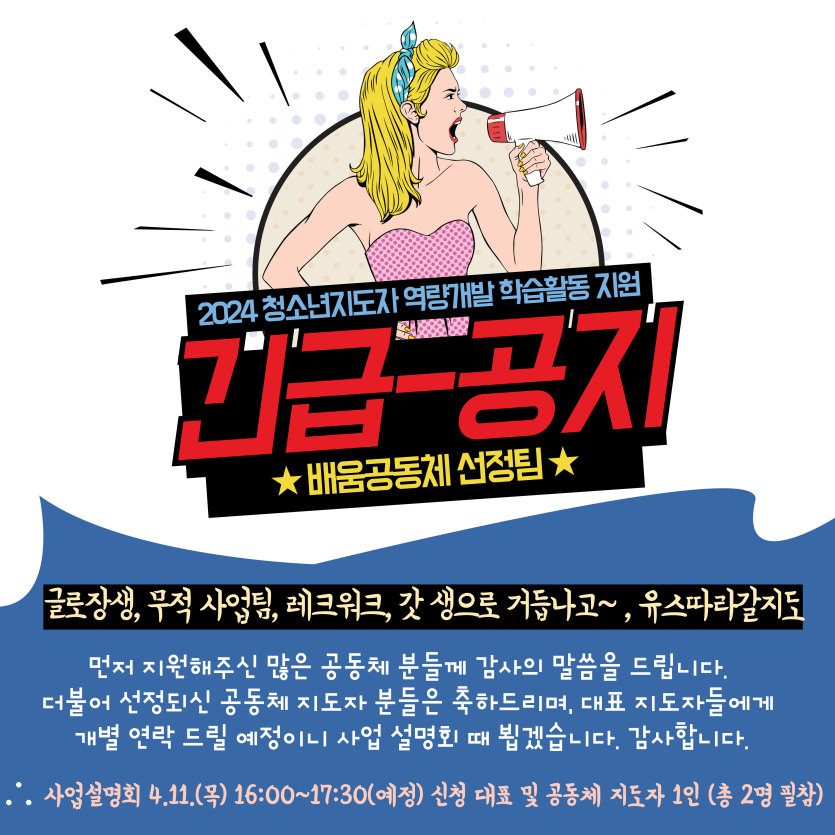 목록 [공지] 2024년 청소년지도자 역량개발 학습활동 지원 배움공동체 선정 안내 페이지 정보 작성자 관리자 댓글 0건 조회 692회 작성일 2024-03-28 본문 추천0 이전글2024년 4월 안전점검 실시 결과보고 24.04.02 다음글서울시립청소년활동진흥센터 2024년도 예산승인내역 및 사용료 고시 24.03.21 댓글 0 댓글목록 등록된 댓글이 없습니다. 목록