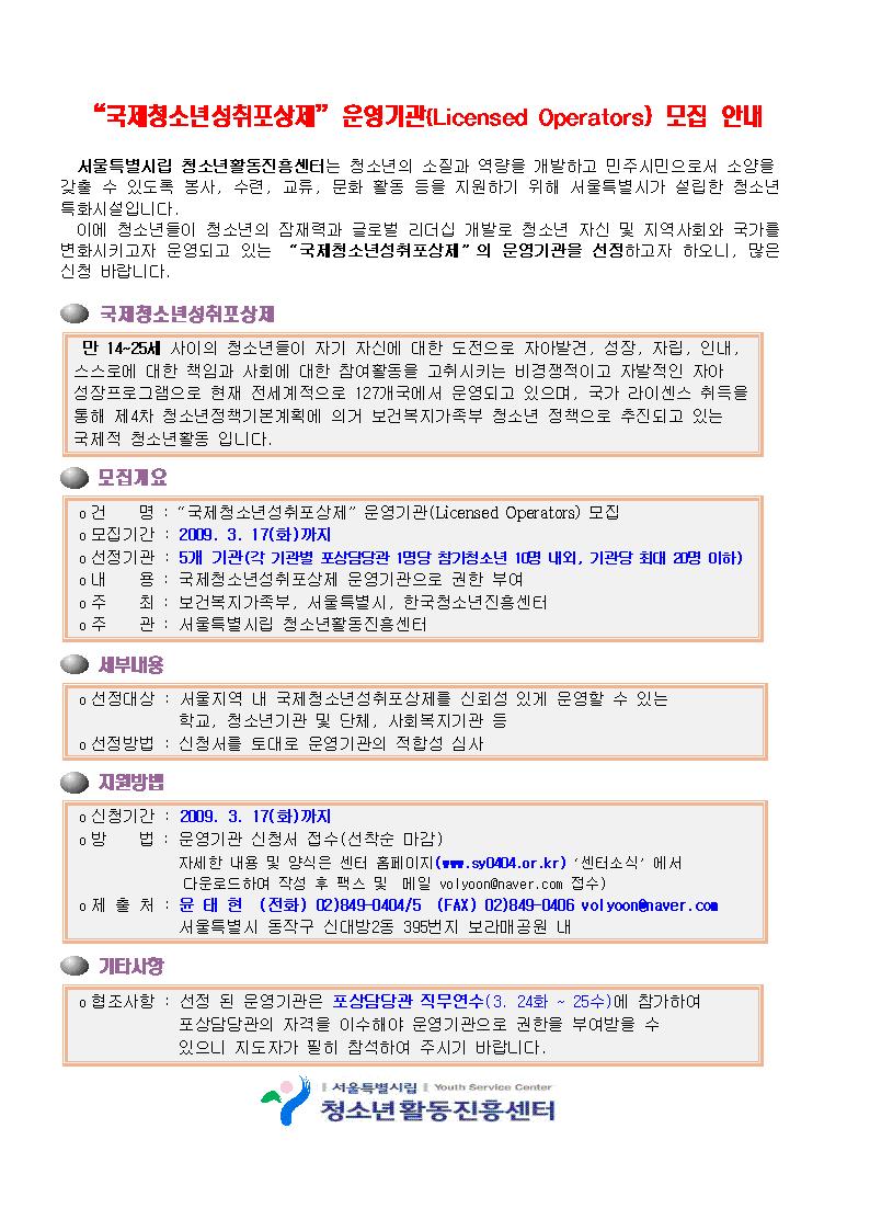 수정 삭제 목록 국제청소년성취포상제 운영기관 모집 안내 페이지 정보 작성자 윤태현 댓글 0건 조회 3,355회 작성일 2009-05-14 본문 추천0 이전글청소년수련활동인증제 교육 설명회 09.05.15 다음글2009 청소년동아리 지원사업 신청 안내 09.05.14 댓글 0 댓글목록 등록된 댓글이 없습니다. 수정 삭제 목록