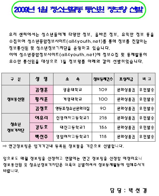 수정 삭제 목록 청소년활동 통신원 1월 정보왕 선발 공지 페이지 정보 작성자 박선경 댓글 0건 조회 3,691회 작성일 2009-05-13 본문 추천0 이전글학교교육과정에 의한 학생봉사활동 운영 설명회 안내 09.05.13 다음글청소년 활동 통신원 4월 정보왕 선발 09.05.12 댓글 0 댓글목록 등록된 댓글이 없습니다. 수정 삭제 목록