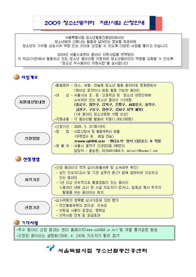 수정 삭제 목록 2009 청소년동아리 지원사업 신청 안내 페이지 정보 작성자 홍승현 댓글 0건 조회 3,563회 작성일 2009-05-14 본문 추천0 이전글국제청소년성취포상제 운영기관 모집 안내 09.05.14 다음글소외 청소년 멘토링 대학생 오리엔테이션 09.05.14 댓글 0 댓글목록 등록된 댓글이 없습니다. 수정 삭제 목록