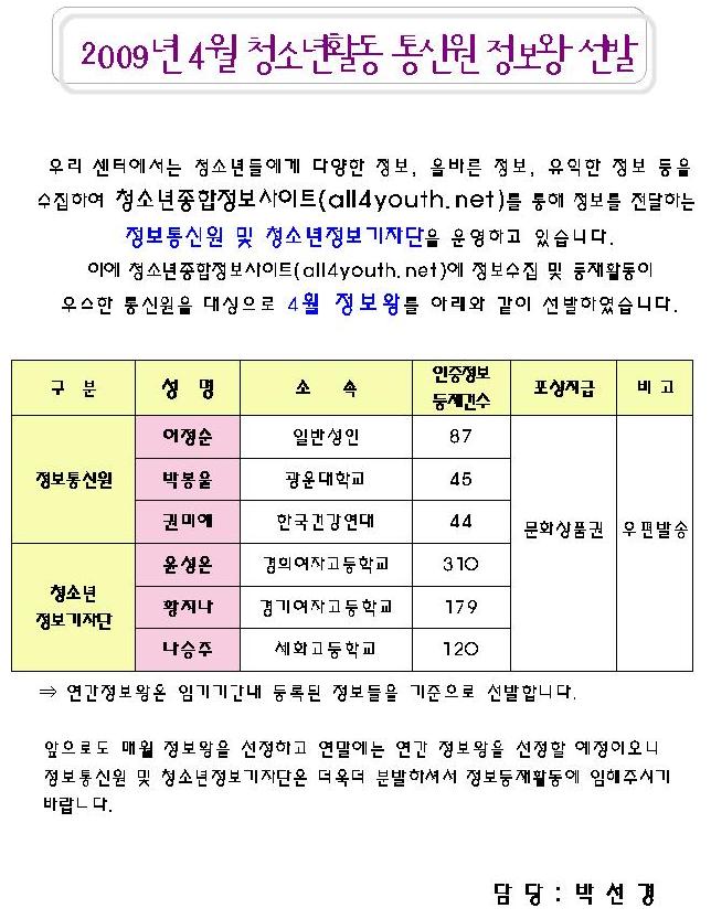 수정 삭제 목록 청소년 활동 통신원 4월 정보왕 선발 페이지 정보 작성자 박선경 댓글 0건 조회 3,924회 작성일 2009-05-12 본문 추천0 이전글청소년활동 통신원 1월 정보왕 선발 공지 09.05.13 다음글센터 별칭짓기 이벤트!! 09.05.11 댓글 0 댓글목록 등록된 댓글이 없습니다. 수정 삭제 목록