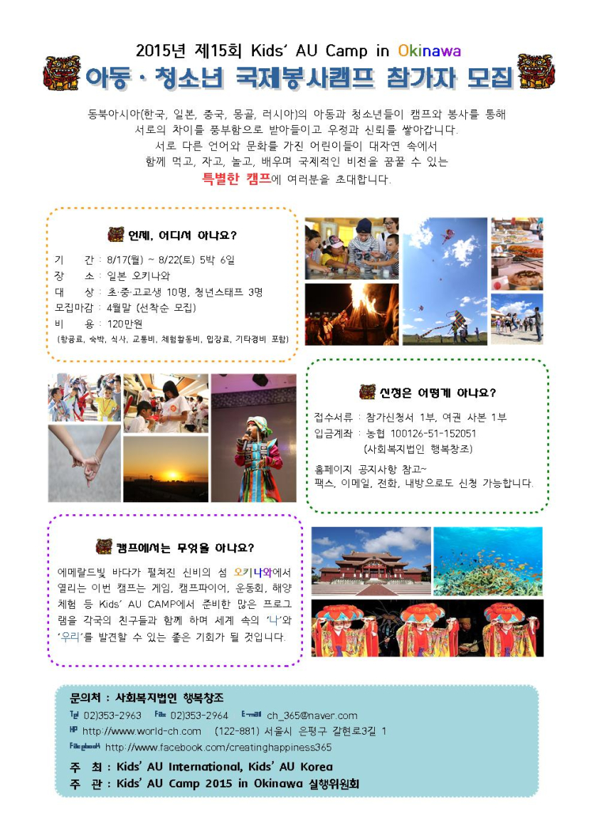 안녕하세요. 사회복지법인 행복창조 Kids' AU Camp 2015 in Okinawa 한국 실행위원회입니다.