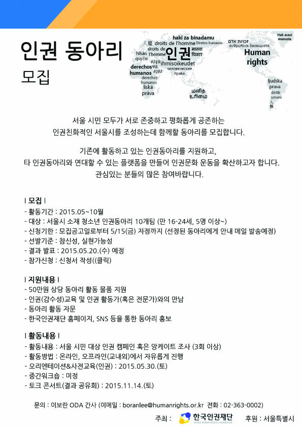[한국인권재단] 2015 제1회 인권 동아리 모집 공고(~5/15(금))