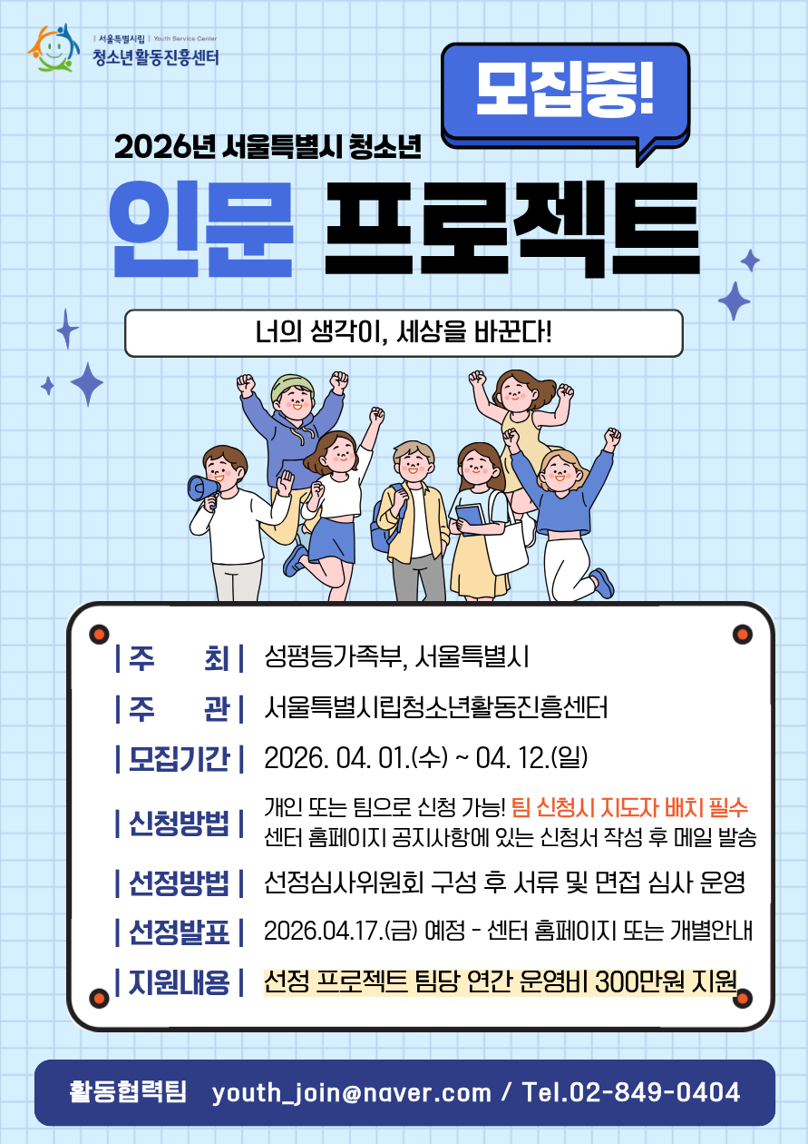 - 공지2026년 제14대 서울특별시 청소년참여위원회 위원 선발 결과 공고 및 발대식 안내2026.02.13