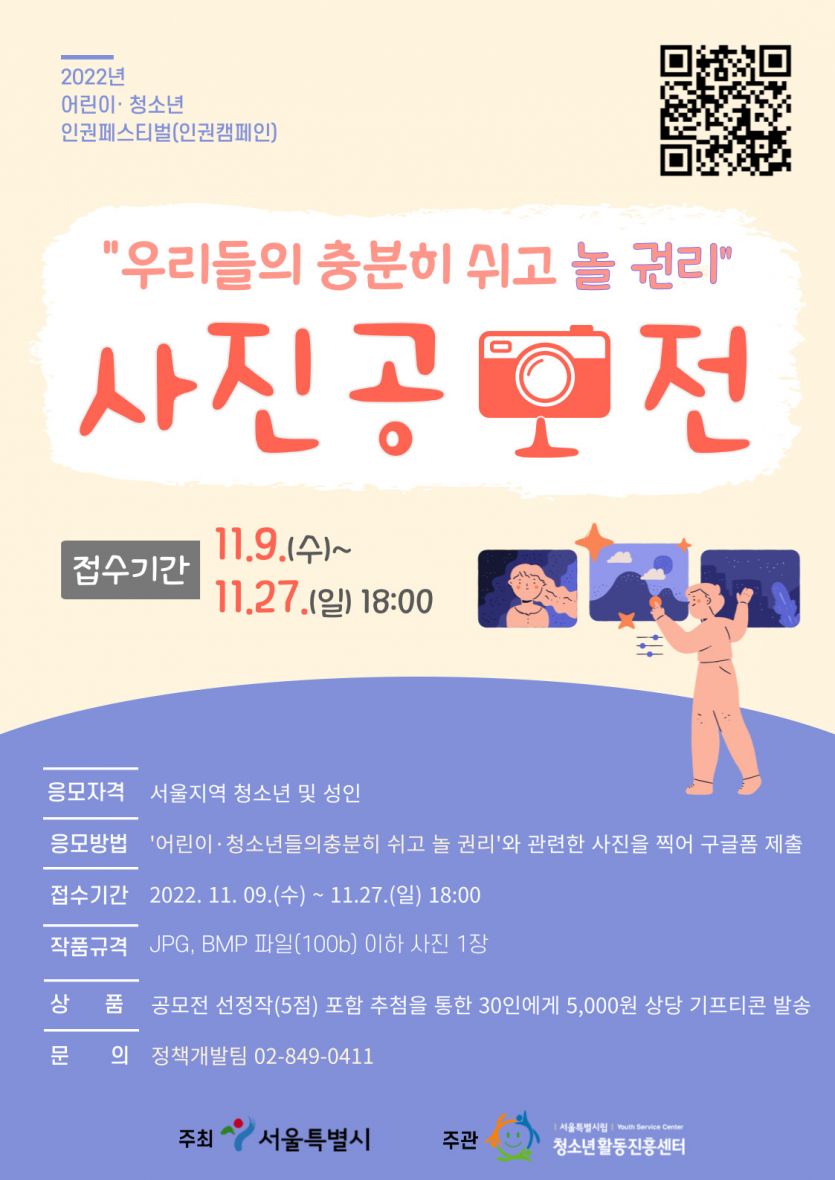 2022년 어린이·청소년 인권페스티벌 중 인권캠페인의 일환으로 사진 공모전을 진행하오니 서울지역 청소년 및 성인 분들의 많은 참여 부탁드립니다.